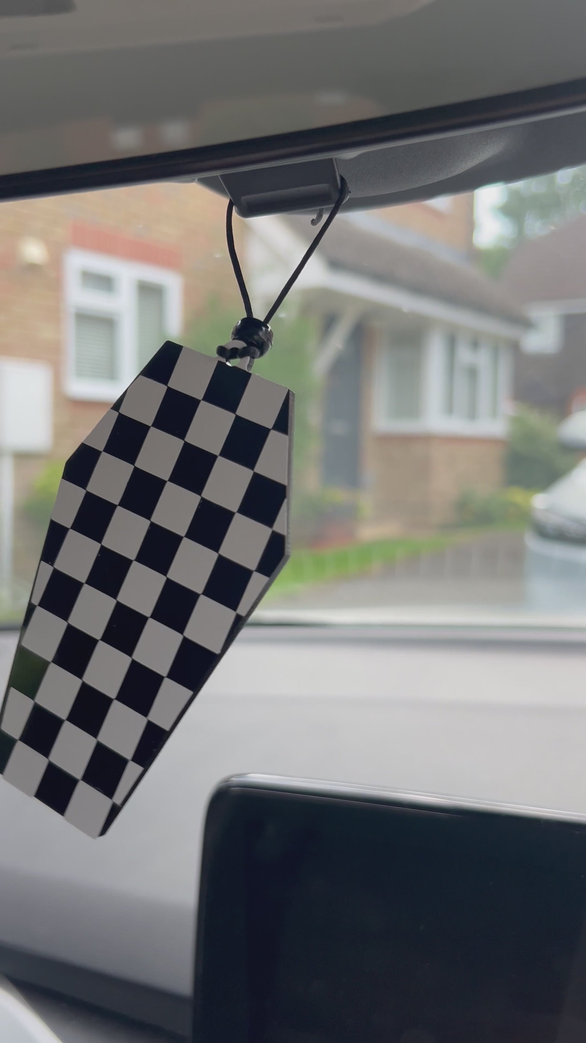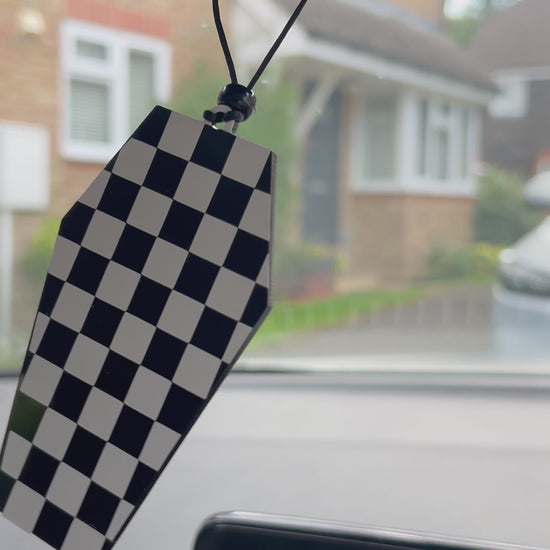 Add a bold, alternative touch to your ride with our Checkered Coffin Rear View Mirror Charm. Featuring a sleek black and white checkered pattern on a coffin-shaped design, this statement accessory is perfect for those who love unique, edgy aesthetics.