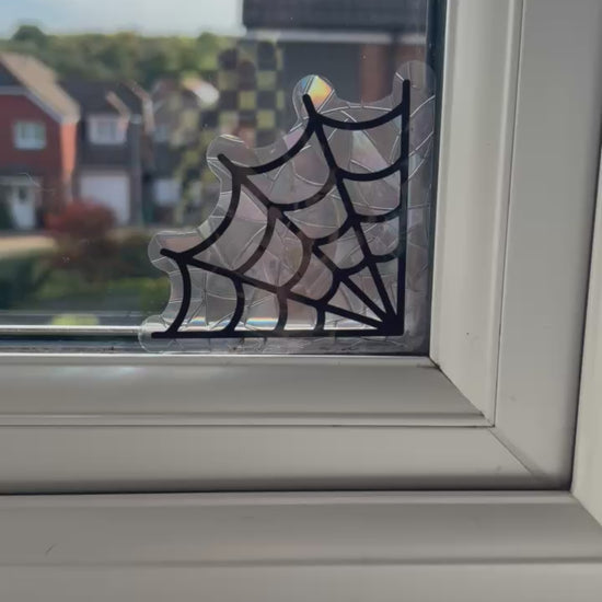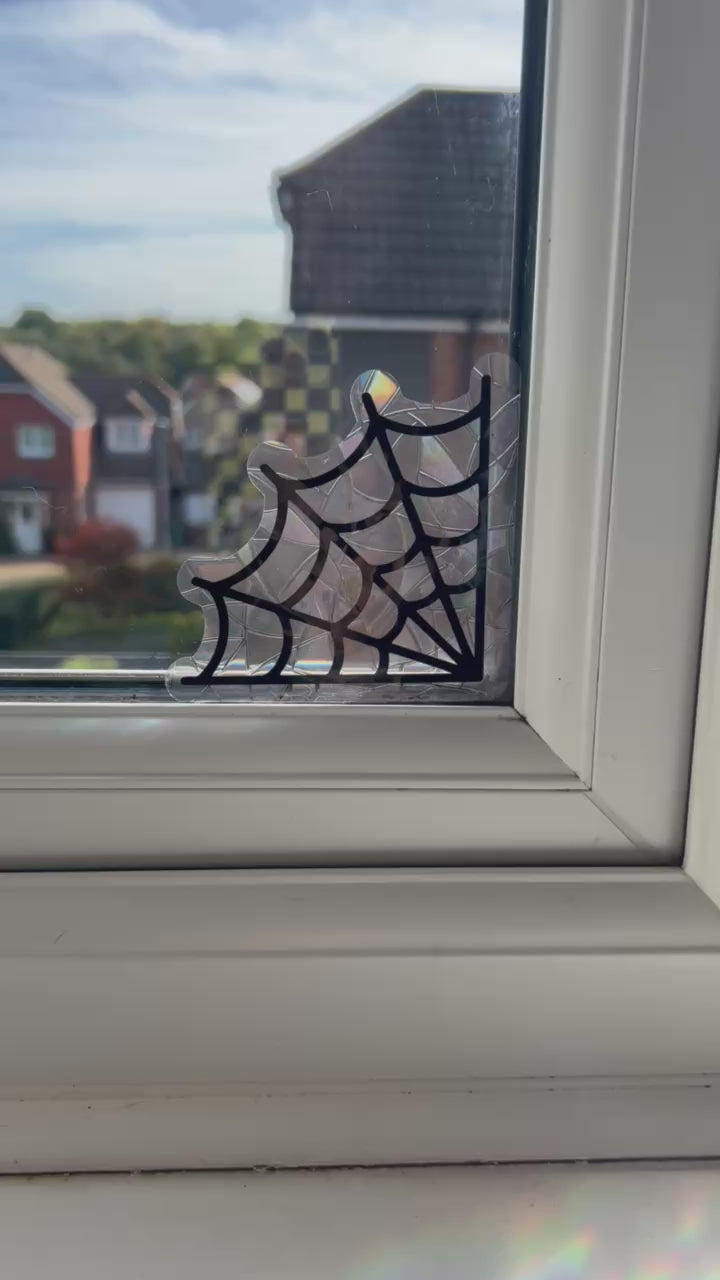 Bring a touch of spooky sparkle to your home this Halloween with these enchanting rainbow maker window stickers! Featuring a classic Halloween design of two cobwebs, ideal for window corners, this holographic decal catches the sunlight and scatters dazzling rainbows across your room.