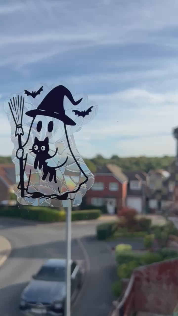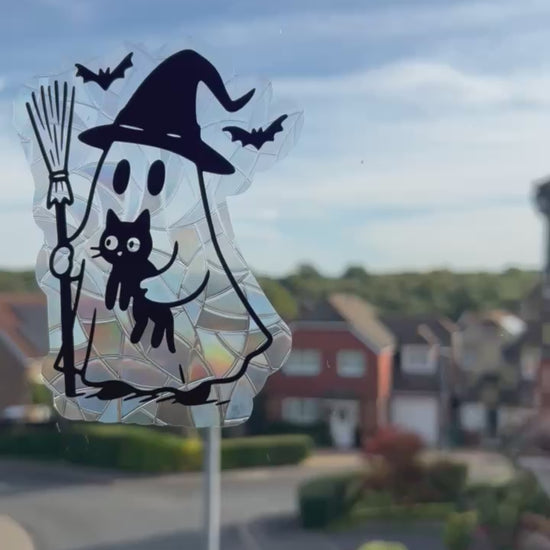 Bring a touch of spooky sparkle to your home this Halloween with these enchanting rainbow maker window stickers! Featuring a classic Halloween design, including a super cute ghost wearing a witch hat carrying a cat, this holographic decal catches the sunlight and scatters dazzling rainbows across your room.