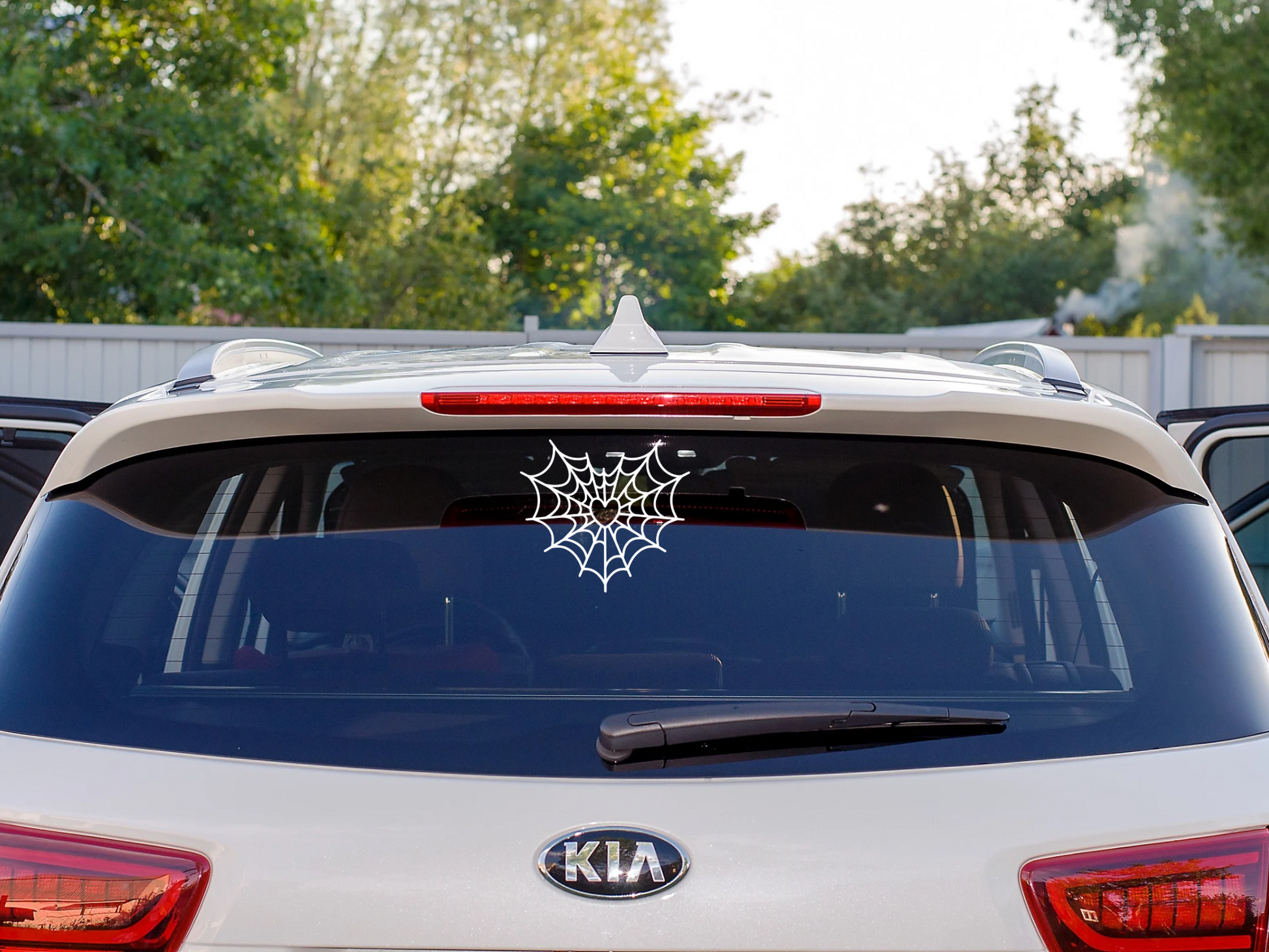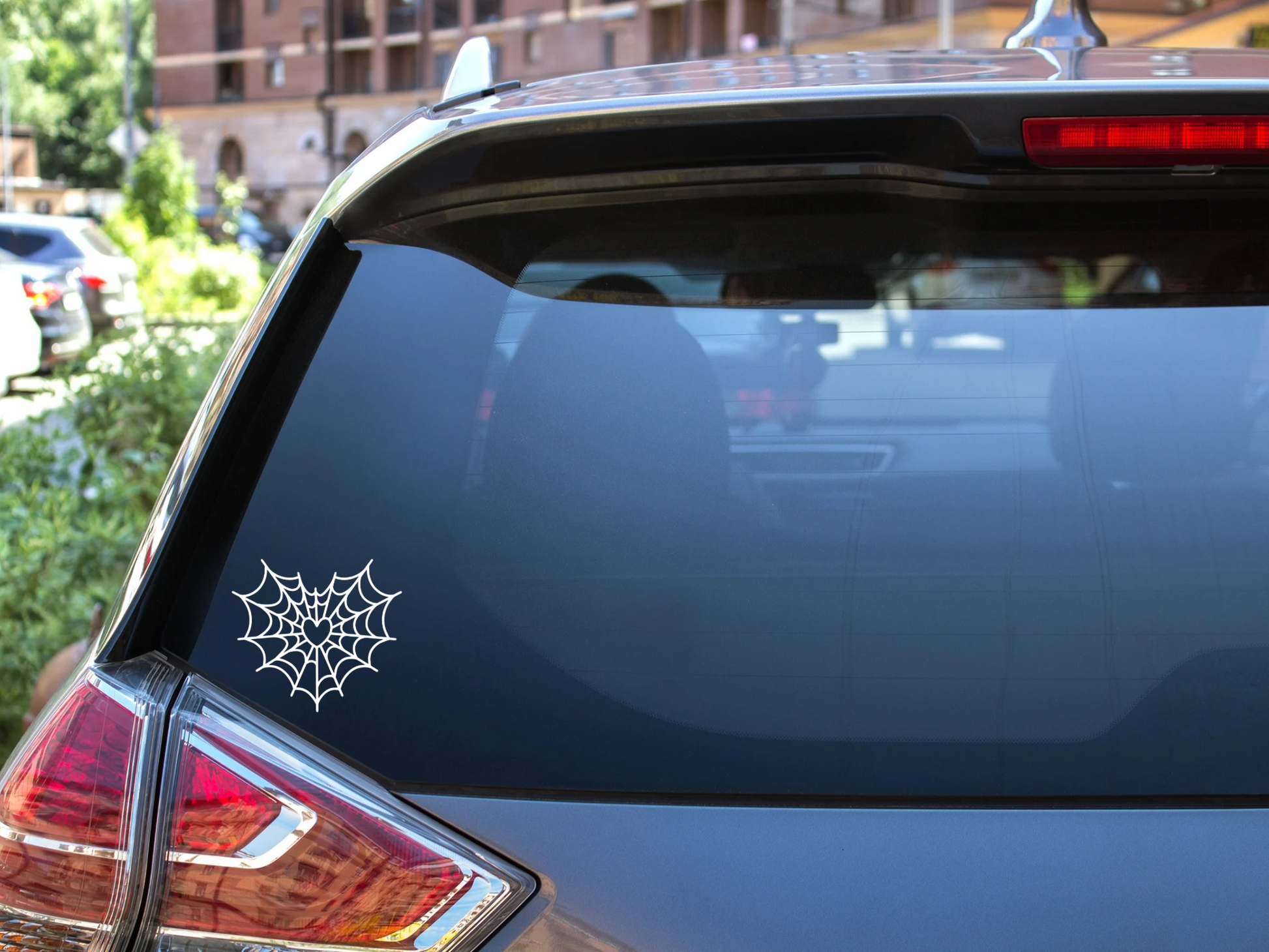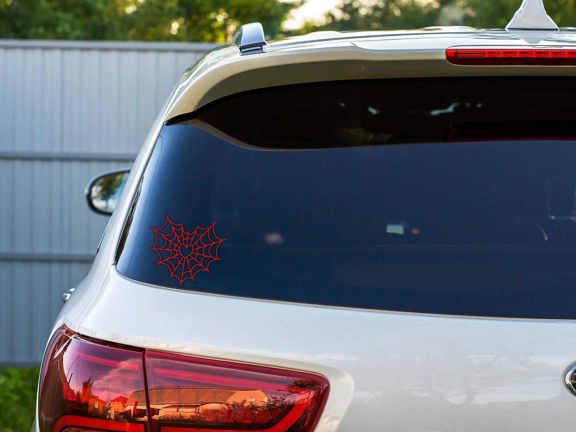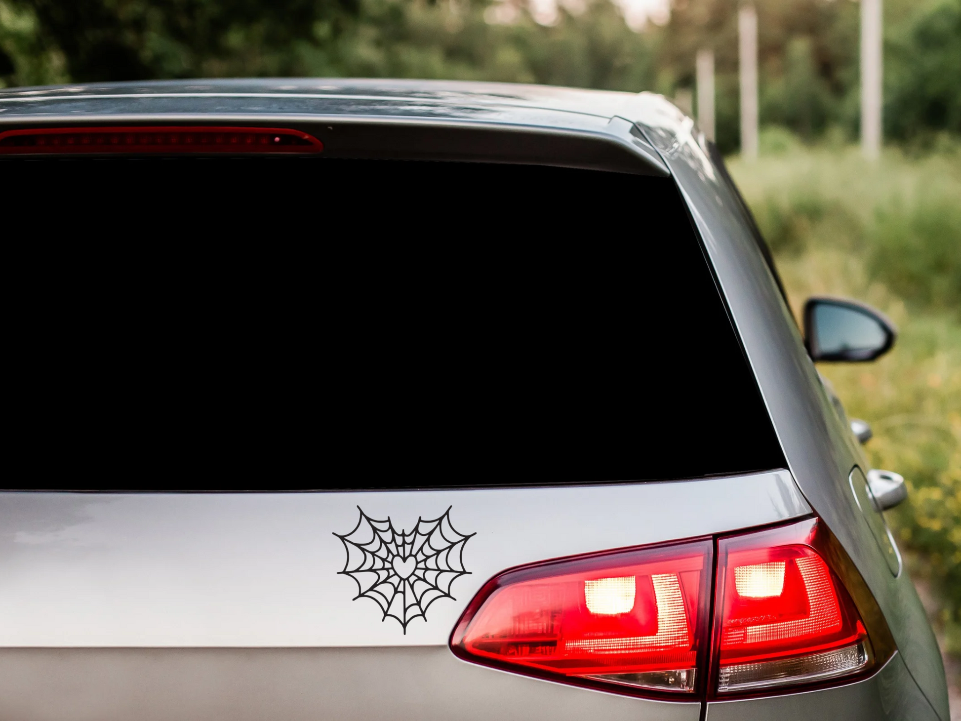 Heart cobweb car decal sticker, available in a range of colours and sizes.