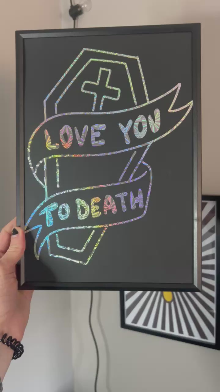Add a bold, edgy touch to your space with this striking foiled art print. Printed on premium black card, the shimmering metallic foil highlights the daring phrase “Love You to Death”, creating a dramatic contrast that catches the eye from every angle. Perfect for expressing passionate devotion with a hint of gothic flair, this print makes a unique gift for someone special, or a standout piece for your own wall.