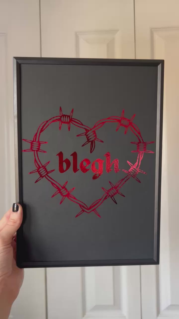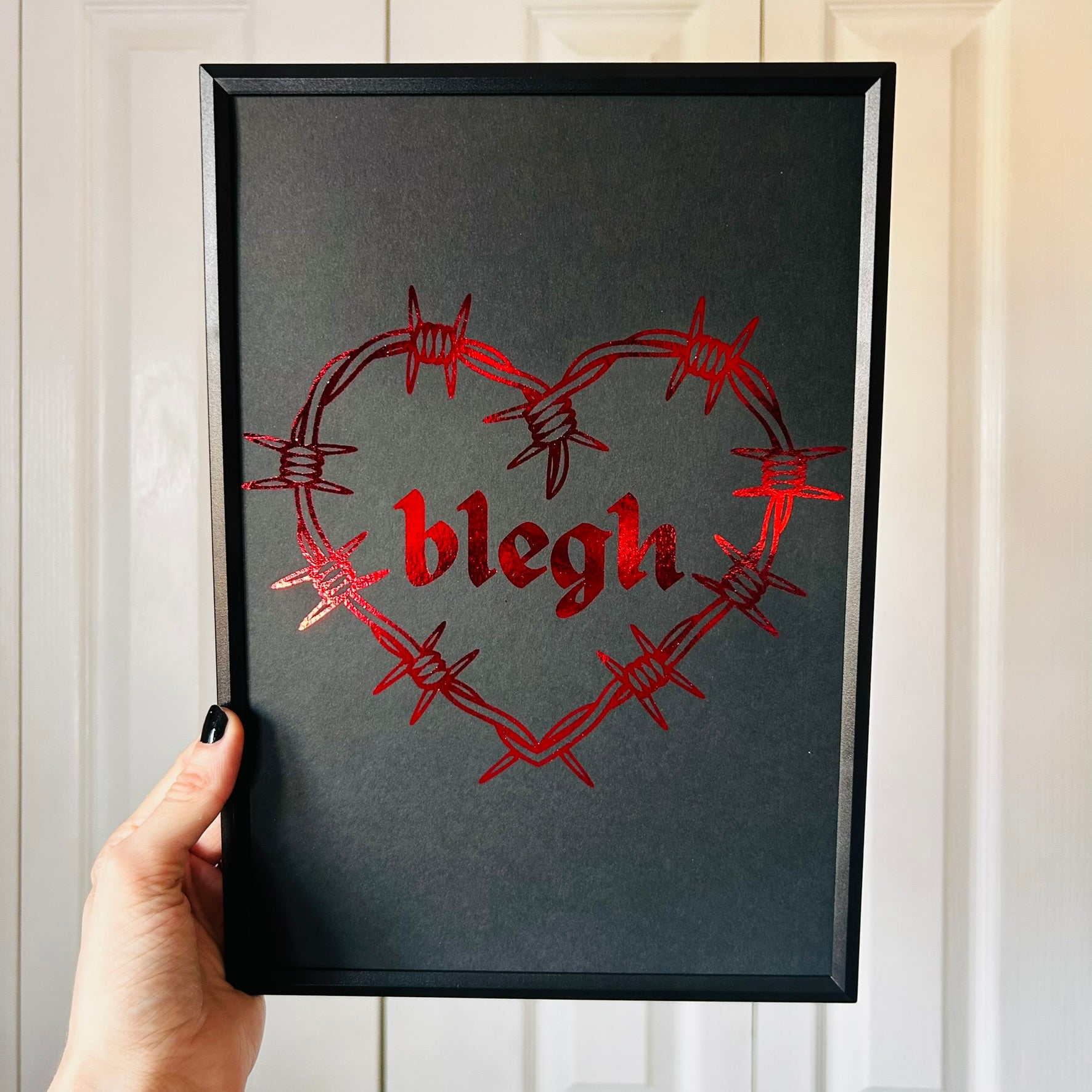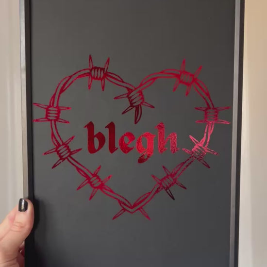 Bring a little attitude to your walls with our “Blegh” foiled artwork print. Featuring bold lettering framed inside a barbed wire heart, this design is the perfect mix of edgy and playful. Printed on deep black cardstock, the metallic foil finish makes the artwork shine with every angle, turning a simple statement into a striking piece of art.
