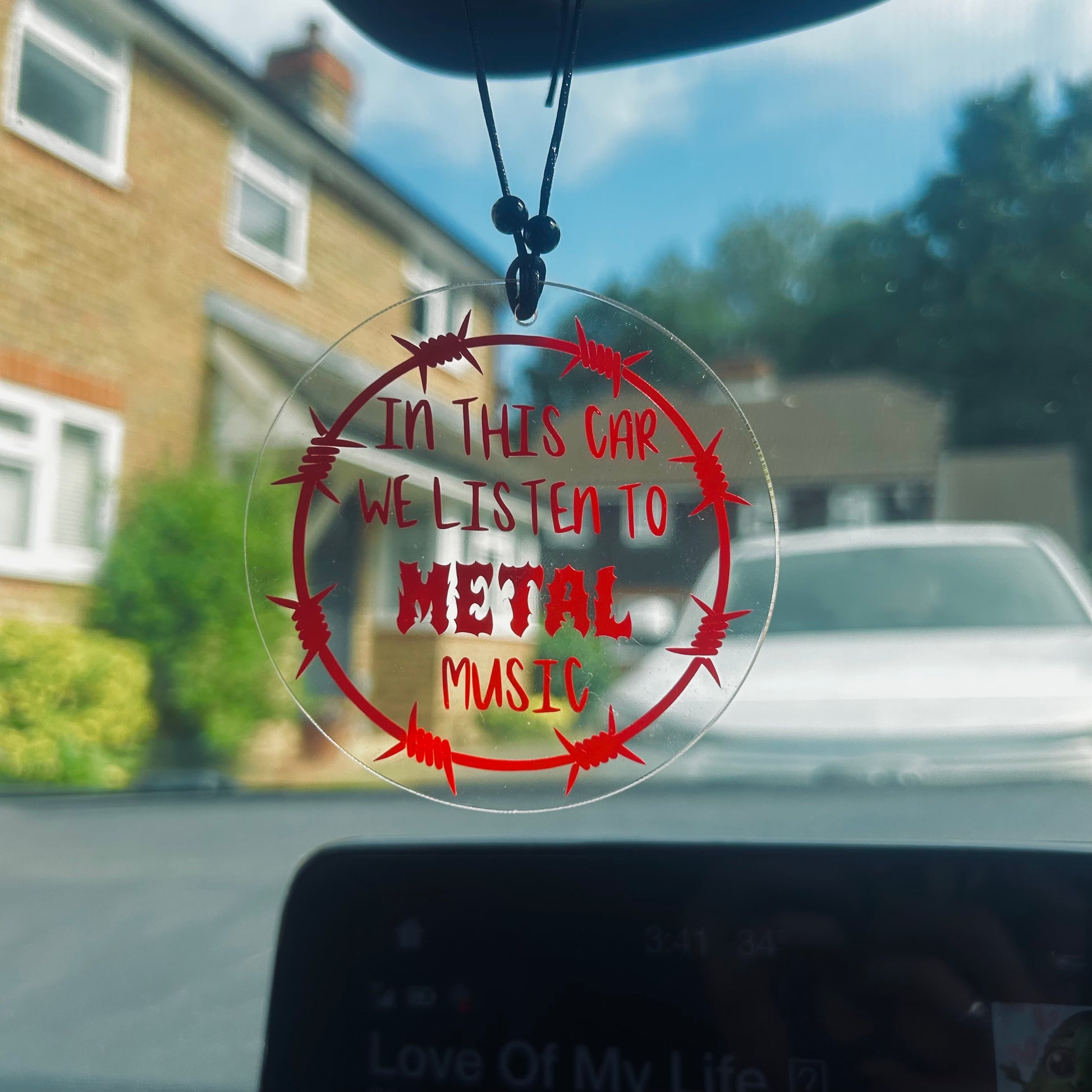 Crank it up and let everyone know what you’re about with this bold car hanger. Featuring the phrase “In This Car We Listen to Metal Music,” this accessory is a must-have for any true metal fan who wants to rep their music taste loud and proud. Perfect for hanging from your rearview mirror, it adds a touch of attitude and shows the world your ride is a metal-only zone.