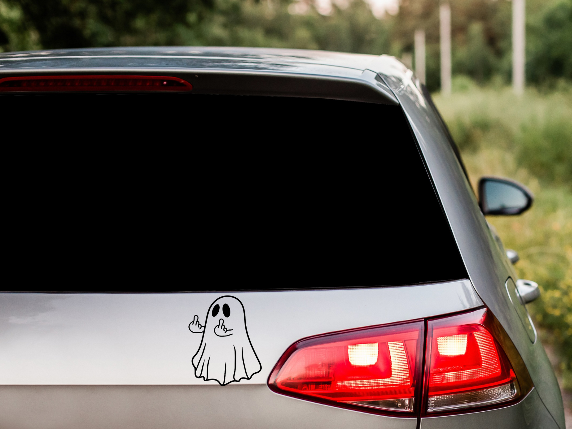 Middle finger ghost car decal sticker, available in a range of colours and sizes.