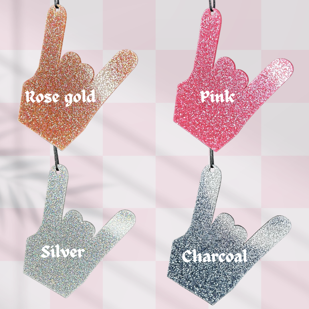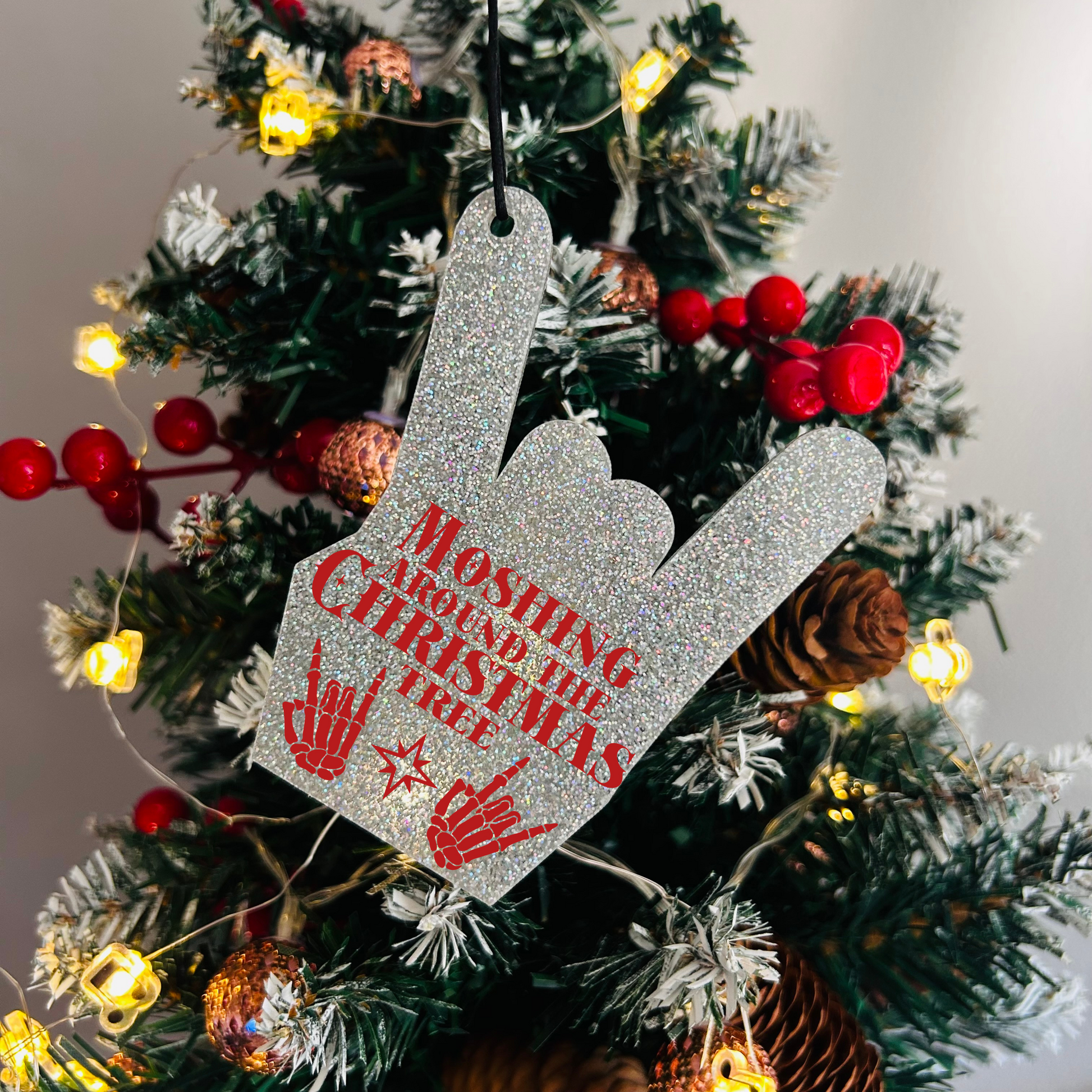 Like to Mosh, even at Christmas time? This bold Christmas tree ornament says it all! Perfect for anyone who prefers their Christmas décor with an alternative twist, this piece combines festive tradition with a tongue-in-cheek edge. With a sparkly "rock on" hand acrylic shape and wording in your colour choice, it’s the ideal decoration for those who aren't afraid to show their music taste off, even during the holiday season.