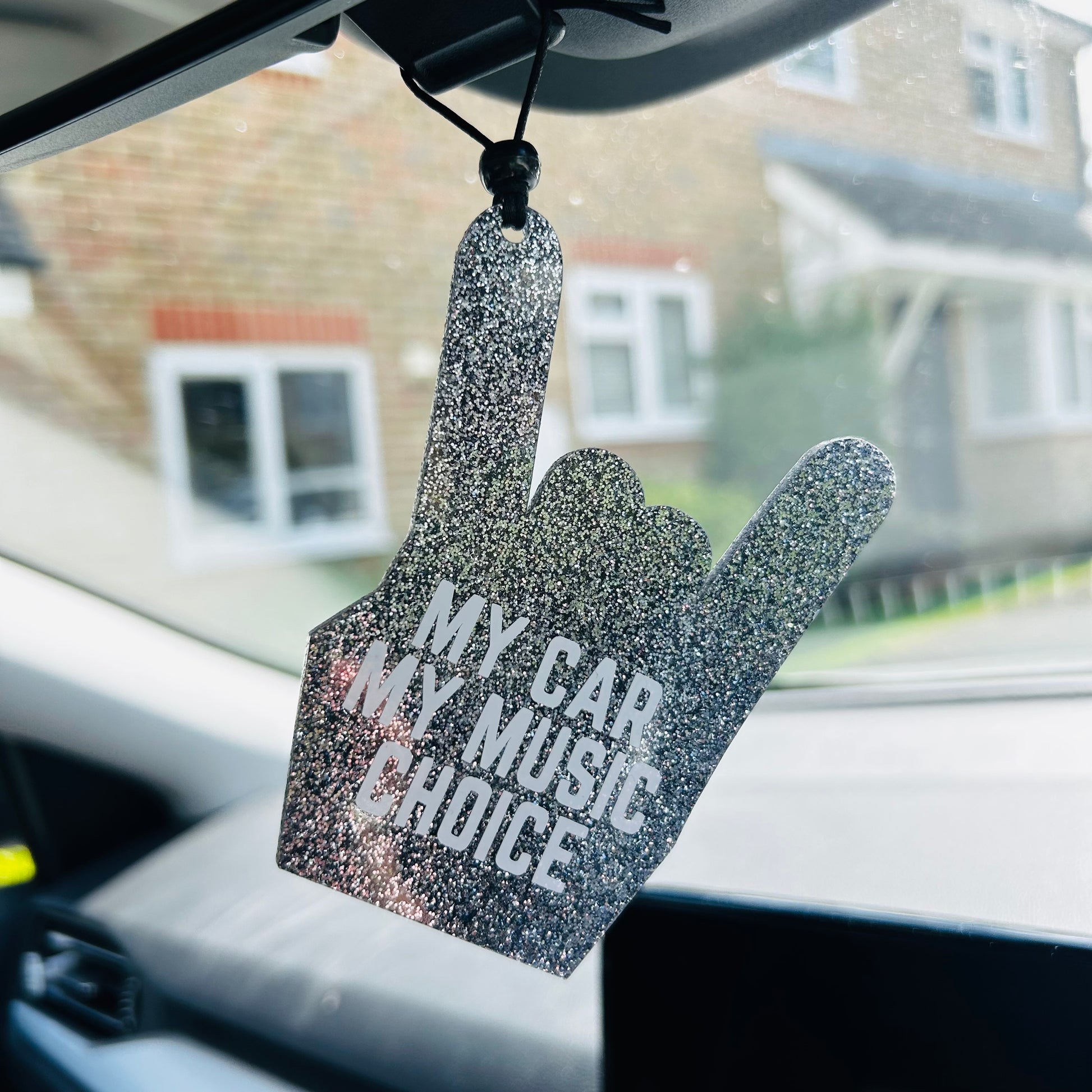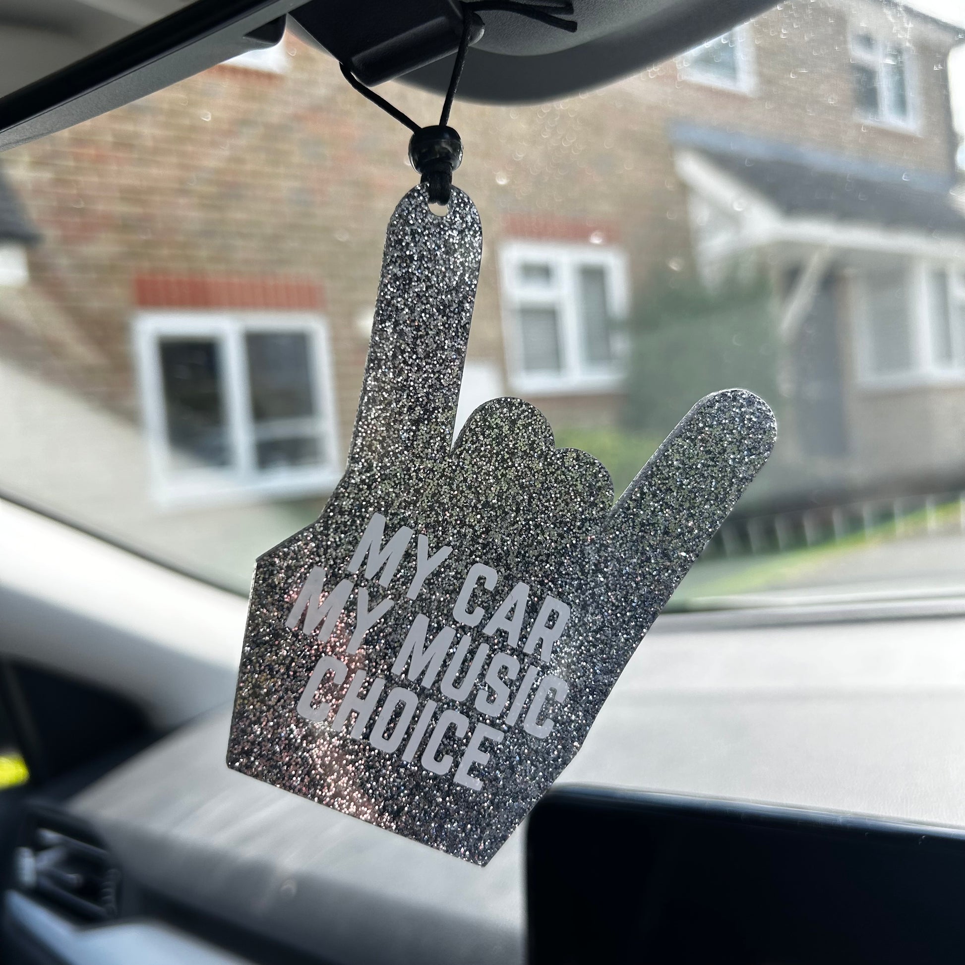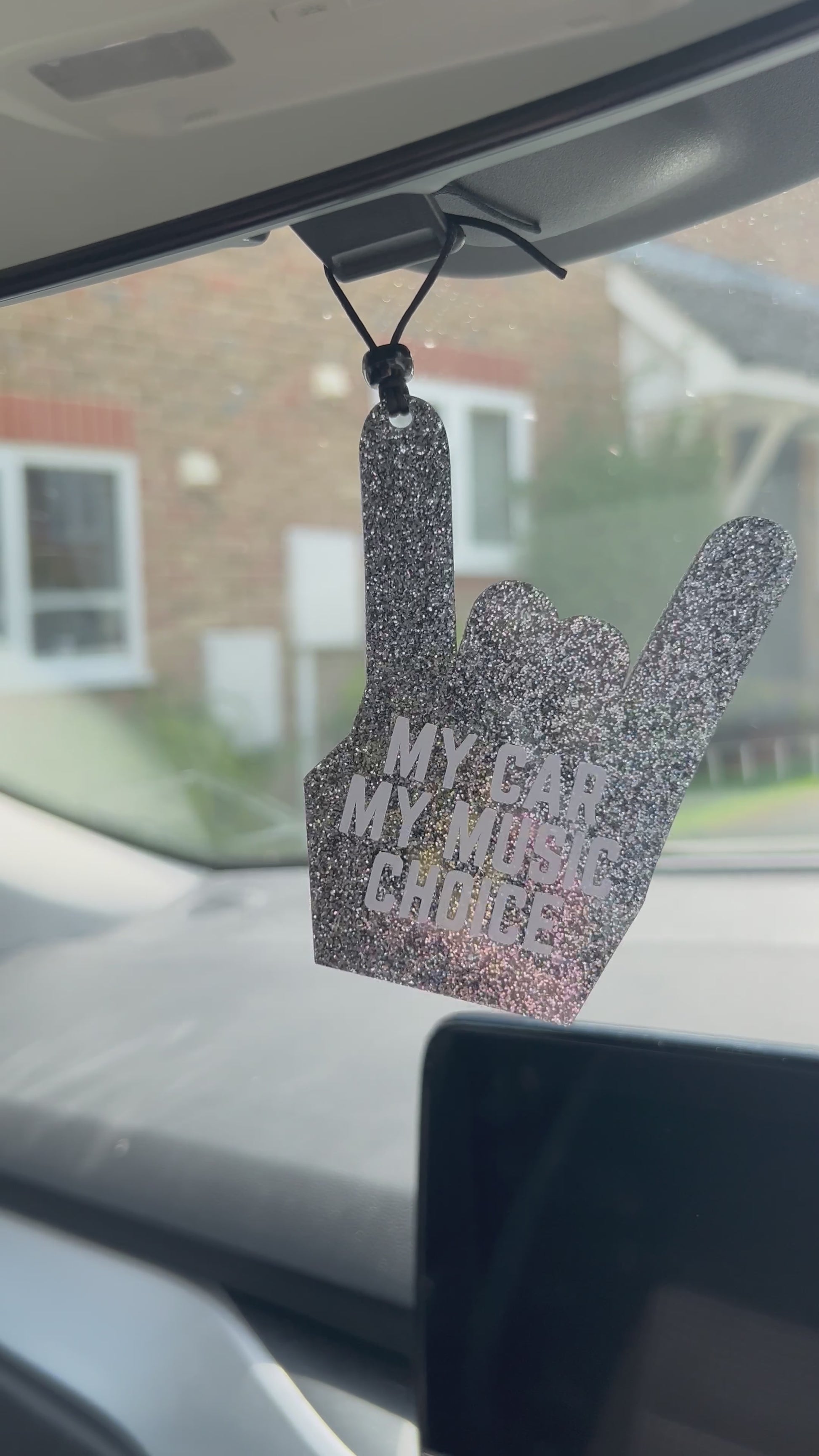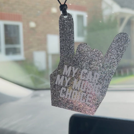 Turn up the volume on your car’s personality with the “My Car. My Music Choice” Rear View Mirror Charm. This bold accessory features a glittery silver rock hand and a statement-making wording in bold pink writing.