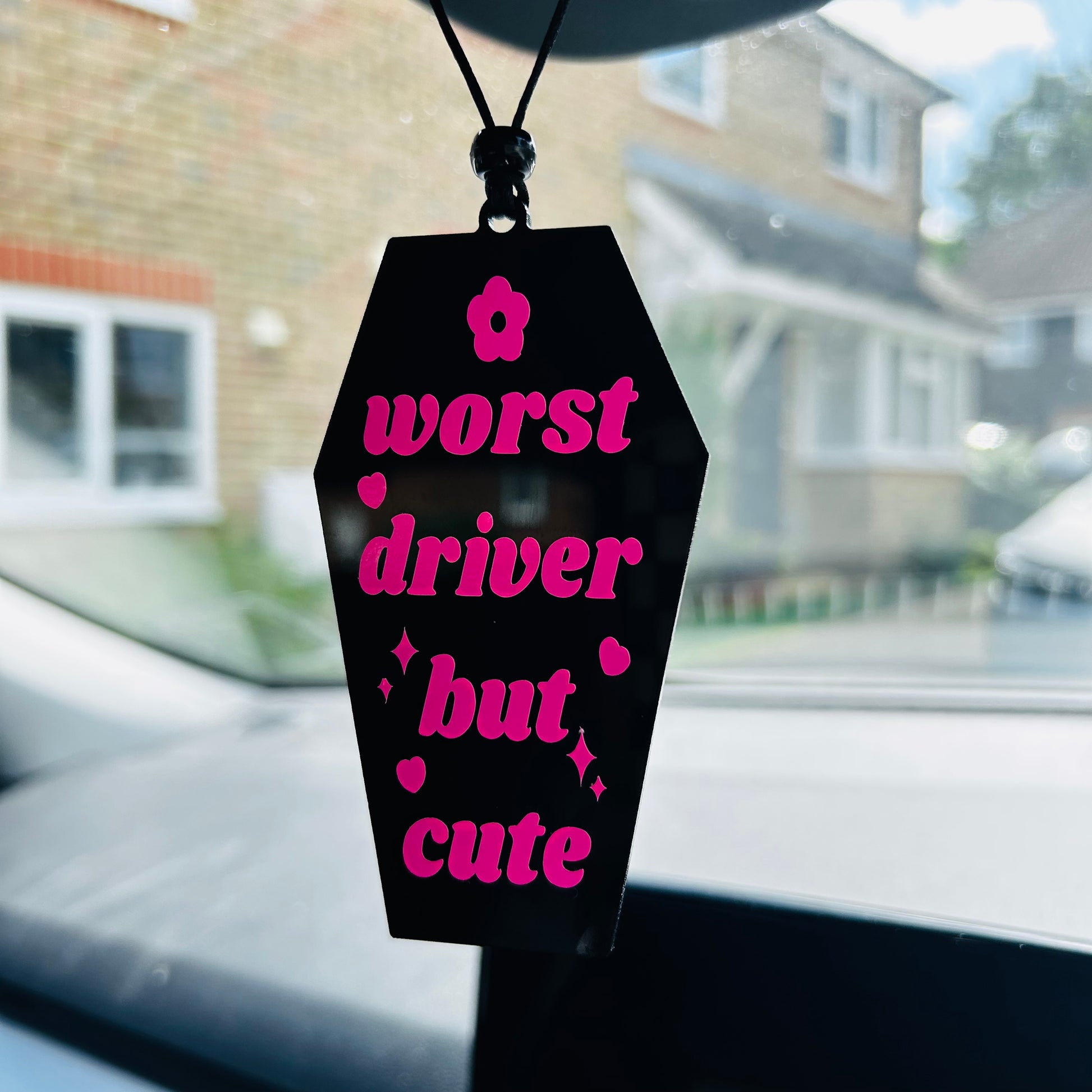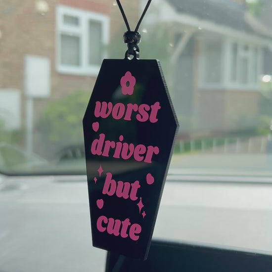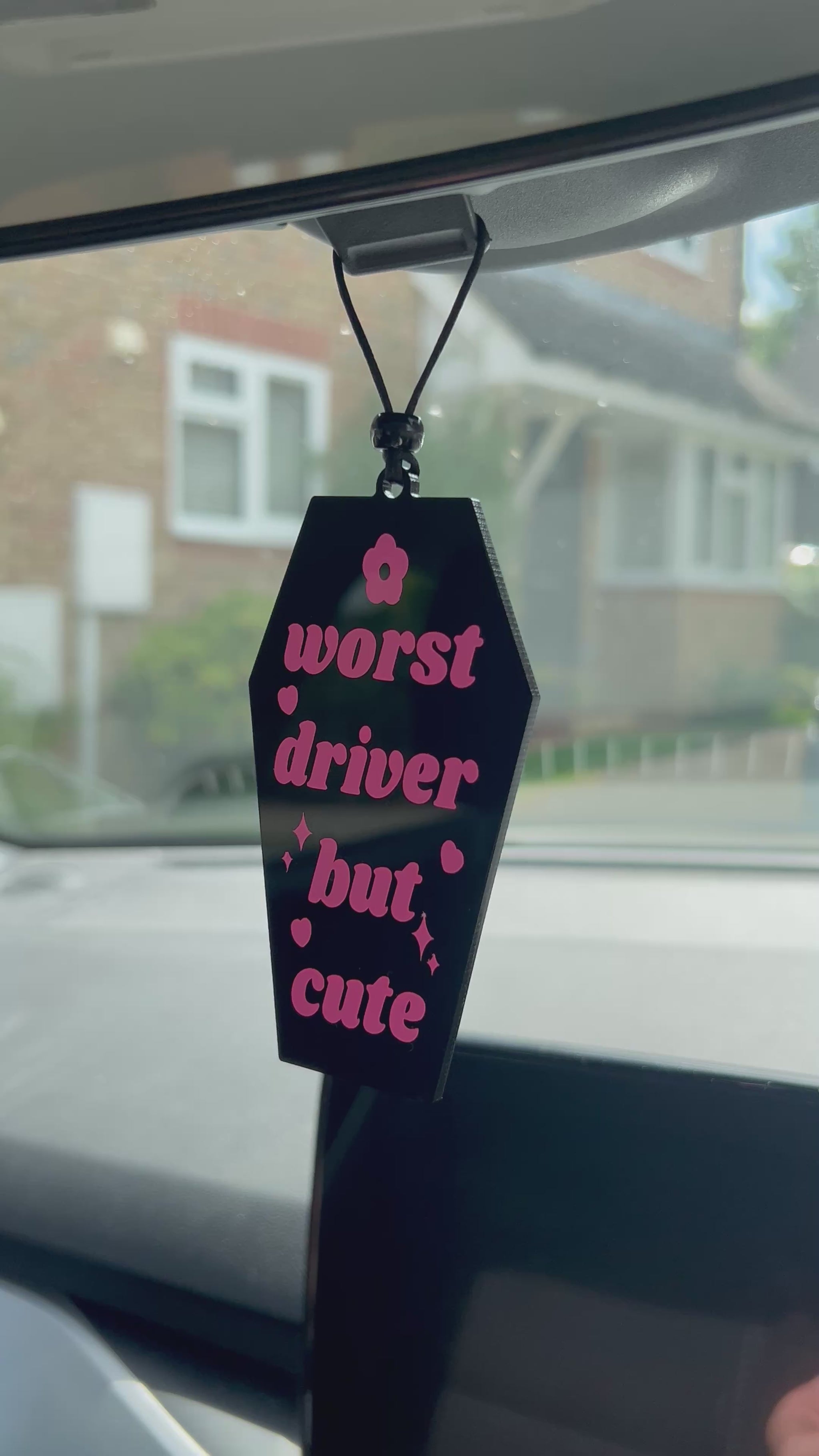Who says bad driving can’t be adorable? The Worst Driver But Cute Rear View Mirror Charm is the perfect blend of sass, humor, and gothic flair. Shaped like a sleek black coffin and adorned with bold pink lettering, it’s your unapologetic reminder that style always comes first.